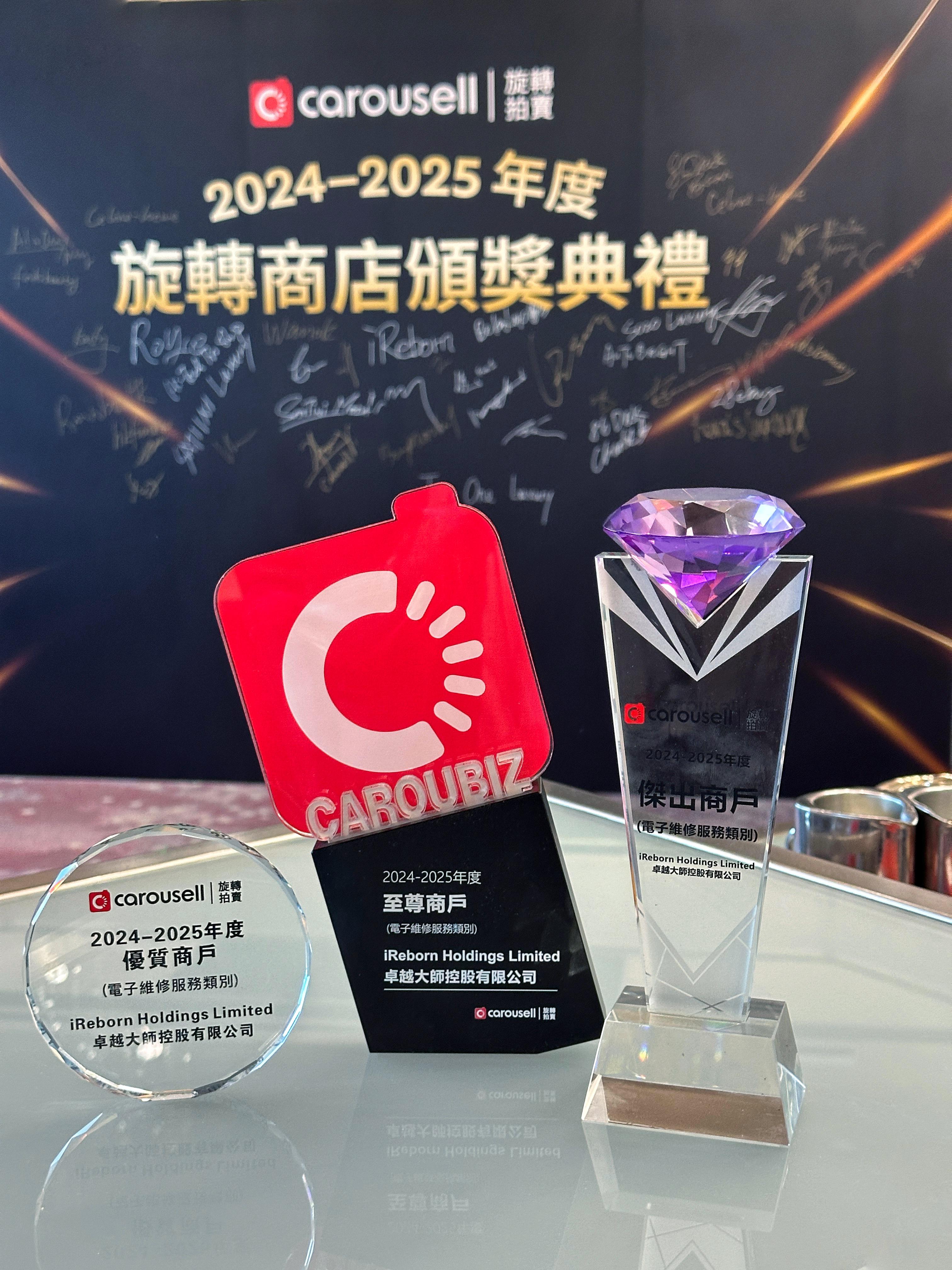 iReborn 有幸奪得 「電子維修服務類別」三個獎項: 至尊商戶大獎、傑出商戶獎、優質商戶獎。